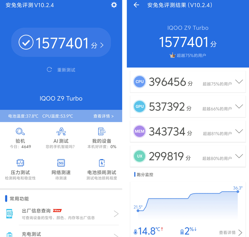 在講完參數之後,我們接下來進入實際測試部分(fēn)。首先我們選擇了安(ān)兔兔和Geekbench來對手機的綜合實力以及CPU表現進行測試。我們将手機調至Monster模式,在室溫為(wèi)22度的室内環境進行測試。在安(ān)兔兔V10版本中(zhōng),iQOO Z9 Turbo的綜合成績為(wèi)1577401分(fēn),其中(zhōng)CPU得分(fēn)39.6萬分(fēn),GPU得分(fēn)53.7萬分(fēn);而在CPU單項測試Geekbench 6.2.2中(zhōng),這款手機單核得分(fēn)1990分(fēn),多(duō)核成績為(wèi)5402分(fēn);接下來我們還對iQOO Z9 Turbo的閃存進行了測試,順序讀取速率為(wèi)4077.22MB/s,順序寫入速度為(wèi)2099.92MB/s。