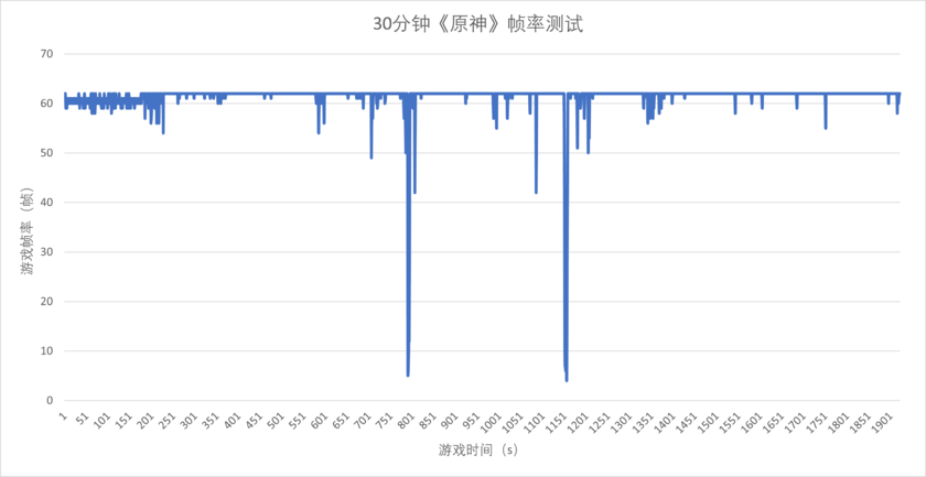 接下來,我們給iQOO Z9 Turbo上點強度,來看看最具(jù)代表性的開放世界手遊《原神》的表現。在遊戲設置中(zhōng),我們開啓了默認的高畫質(zhì)選項,并手動将幀率設定為(wèi)60幀。在室溫22度的環境下,開啓Monster模式後,進行了30分(fēn)鍾的遊戲測試。測試過程中(zhōng),我們主要在野外進行跑圖和打怪。從測試結果顯示,iQOO Z9 Turbo《原神》30分(fēn)鍾測試的平均幀率為(wèi)61.38幀,遊戲過程中(zhōng),幀率保持相對穩定,沒有(yǒu)出現明顯的波動。從幀率曲線(xiàn)圖來看,盡管在第801秒(miǎo)和1151秒(miǎo)時出現了幀率大幅下降,但這主要是在打開背包加載物(wù)品時的正常現象,對整體(tǐ)遊戲體(tǐ)驗影響不大。因此,綜合來看,iQOO Z9 Turbo在穩定幀率方面表現得相當出色,為(wèi)玩家提供了流暢的遊戲體(tǐ)驗。從實際遊戲體(tǐ)驗來看,這款手機能(néng)夠輕松應對《原神》這類高負載遊戲。雖然在某些打鬥場景中(zhōng)偶爾會出現輕微的幀率波動,但基本上肉眼難以察覺,整體(tǐ)遊戲體(tǐ)驗非常流暢。在遊戲過程中(zhōng),我們可(kě)以感受到機身中(zhōng)部的溫度逐漸上升,但手部握持區(qū)域的溫度仍然保持在可(kě)接受範圍内,不會對遊戲體(tǐ)驗産(chǎn)生明顯影響。